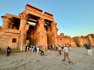 No fim do dia, o cruzeiro chegou a Kom Ombo, cidade localizada ao norte de Aswan. Ali está o Templo de Kom Ombo, um dos monumentos mais curiosos do Egito por ter sido construído com duas áreas simétricas dedicadas a divindades diferentes: Sobek, associado ao crocodilo, e Hórus.